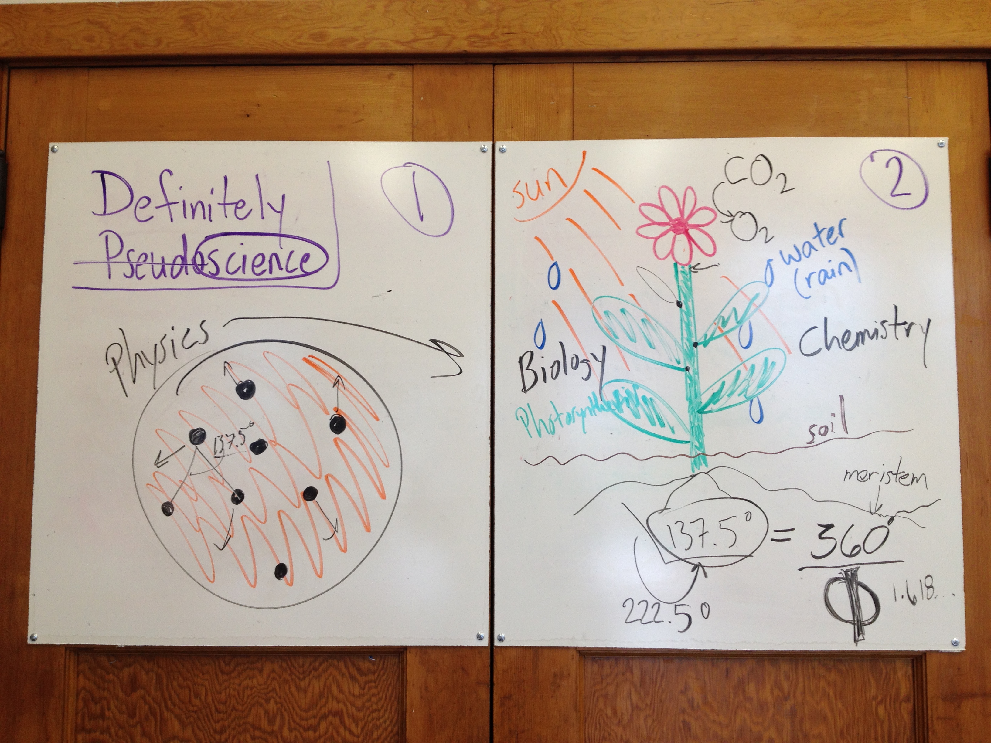 We brought Unit 1 to a close by revisiting the Golden Ratio.  Students were introduced to the concept of “respectful scientific discourse” and practiced sharing their thoughts about whether the Golden Ratio should be considered science or pseudoscience.  Students practiced discourse in groups of 4 multiple times throughout the period.  Between group discussions, we revisited the Golden Ratio.  Students re-watched a segment of the first video (below) and we discussed the effect of the video production (music, narration, images) on their perception of the Golden Ratio as science or pseudoscience.  Students were reminded of the Bill Nye video we watched where they learned that practitioners of pseudoscience often play on our senses and our emotions to try and earn our trust (and our money!).  We then watched a video by Hank Green (SciShow), where the Golden Ratio is presented in a style that might be seen as more credible than the first video.  We concluded the lesson either by watching video segments by Vi Hart (see the September 21 post), or more comprehensibly for the students, through an artistic representation  by the teacher, of how the Golden Ratio manifests in plant growth through the actions of hormones.  As our understanding of plant hormones and genetics grows, it would appear the Golden Ratio is in fact firmly grounded in science, as least with respect to plants.