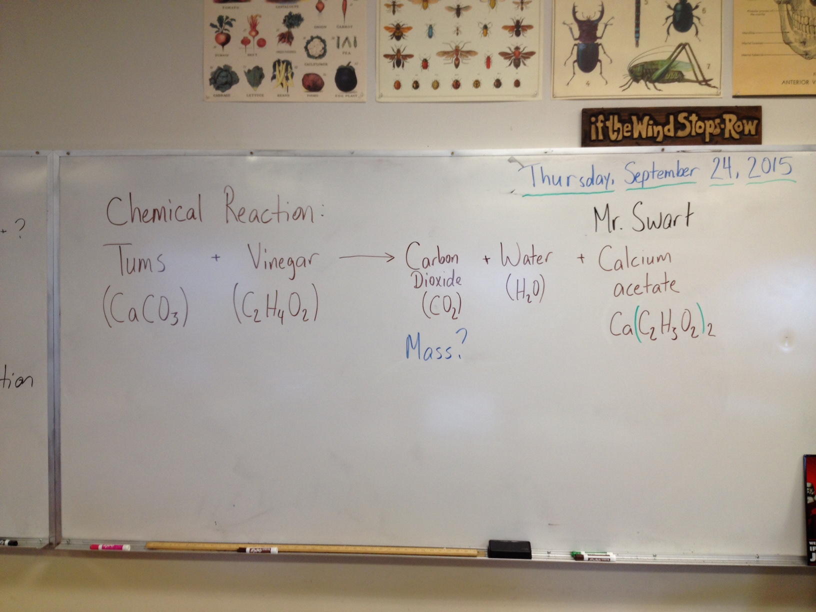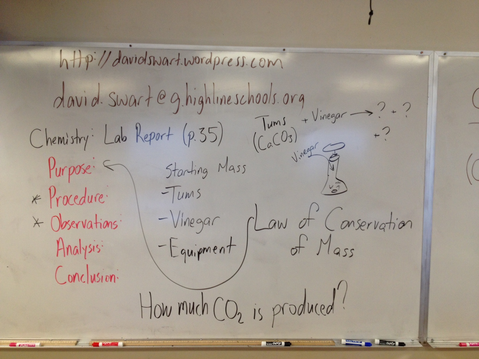 Following up on the conservation of matter lesson from yesterday, students worked in groups to conduct a similar experiment to the baking soda and vinegar demonstration. Today, students were tasked with experimentally testing the law of conservation of mass by mixing known masses of vinegar and Tums (calcium carbonate), then capturing the carbon dioxide released in the experiment in a balloon placed over the flask. They were tasked with determining how much carbon dioxide is produced but the challenge was that, unlike the demonstration yesterday, they could not simply allow the carbon dioxide to escape into the atmosphere. After much trial and error, students gained practical experience working with various pieces of glassware, reagents, the digital balance, thinking through order of experimental operations, recording observations, and sharing their understanding of what was happening during the chemical reaction. We concluded with a discussion of the chemical reaction (pictured below). Students will meet tomorrow in the library computer lab to compile their findings into a lab report. Students were encouraged to take pictures or video into their investigation today and those can be incorporated into the lab report.