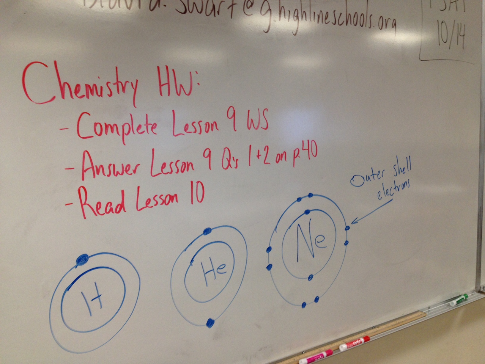 Students took notes from the Lesson 9 PowerPoint, learning about the concepts of atomic mass, protons, and neutrons, and isotopes. Students also learned about electrons and the concept of electronegativity. They then worked together in groups of four to complete the Lesson 9 Worksheet. For homework, students were instructed to complete the worksheet, answer questions 1 and 2 from the end of Lesson 9 in the textbook, and then to read Chapter 10 in the textbook. Notes from the whiteboard are pictured below.