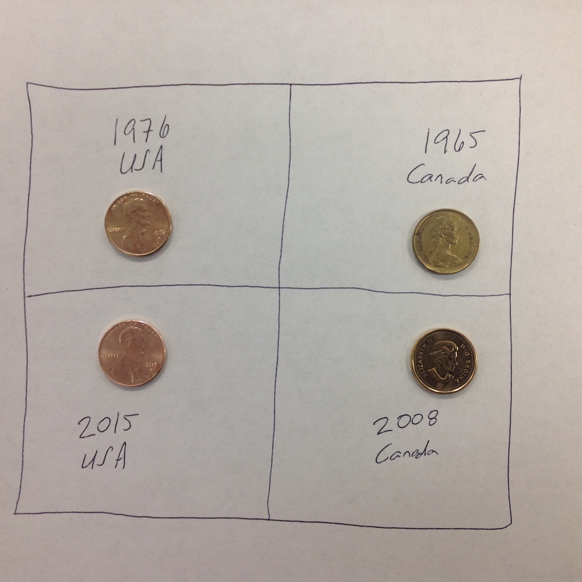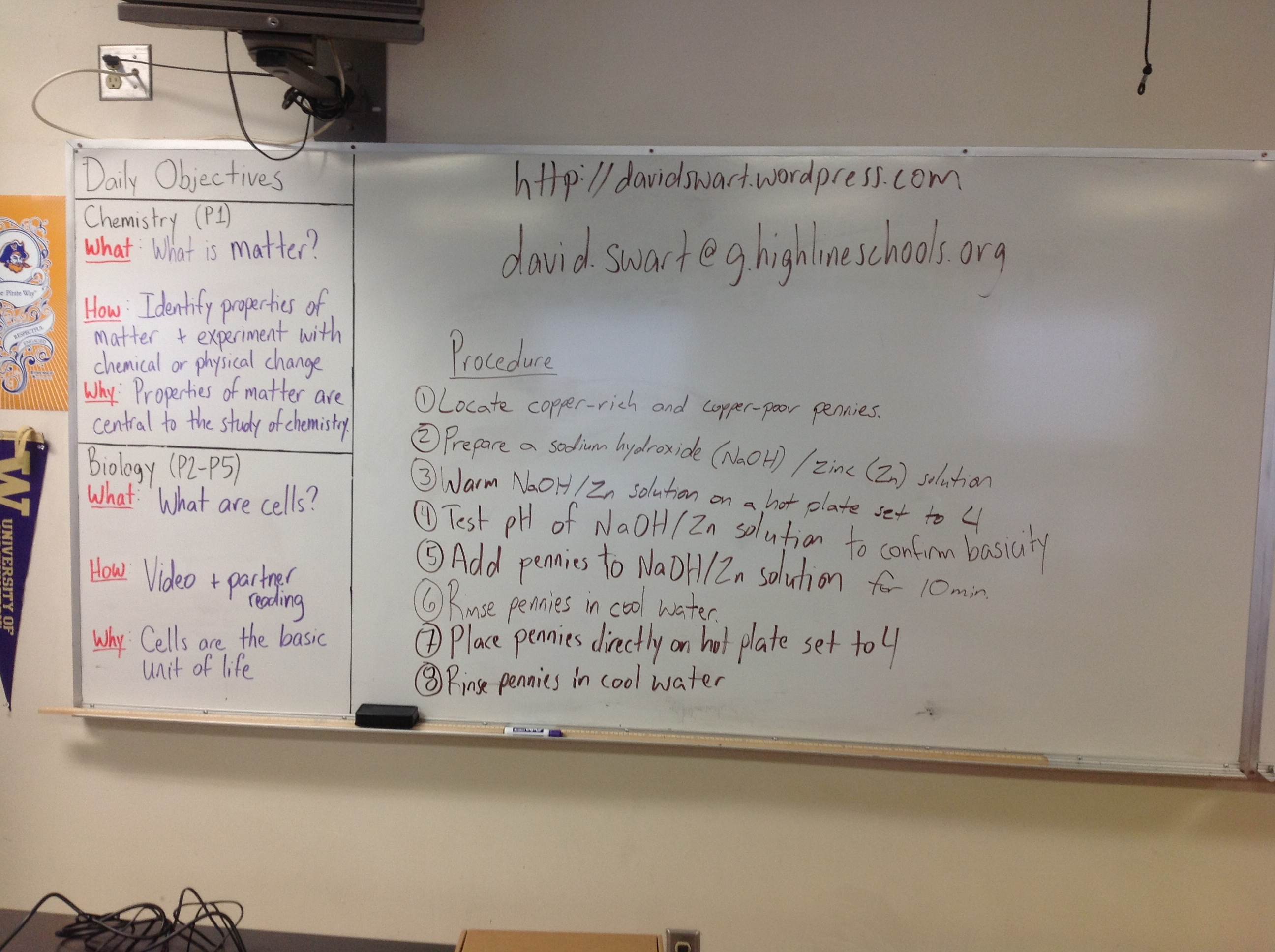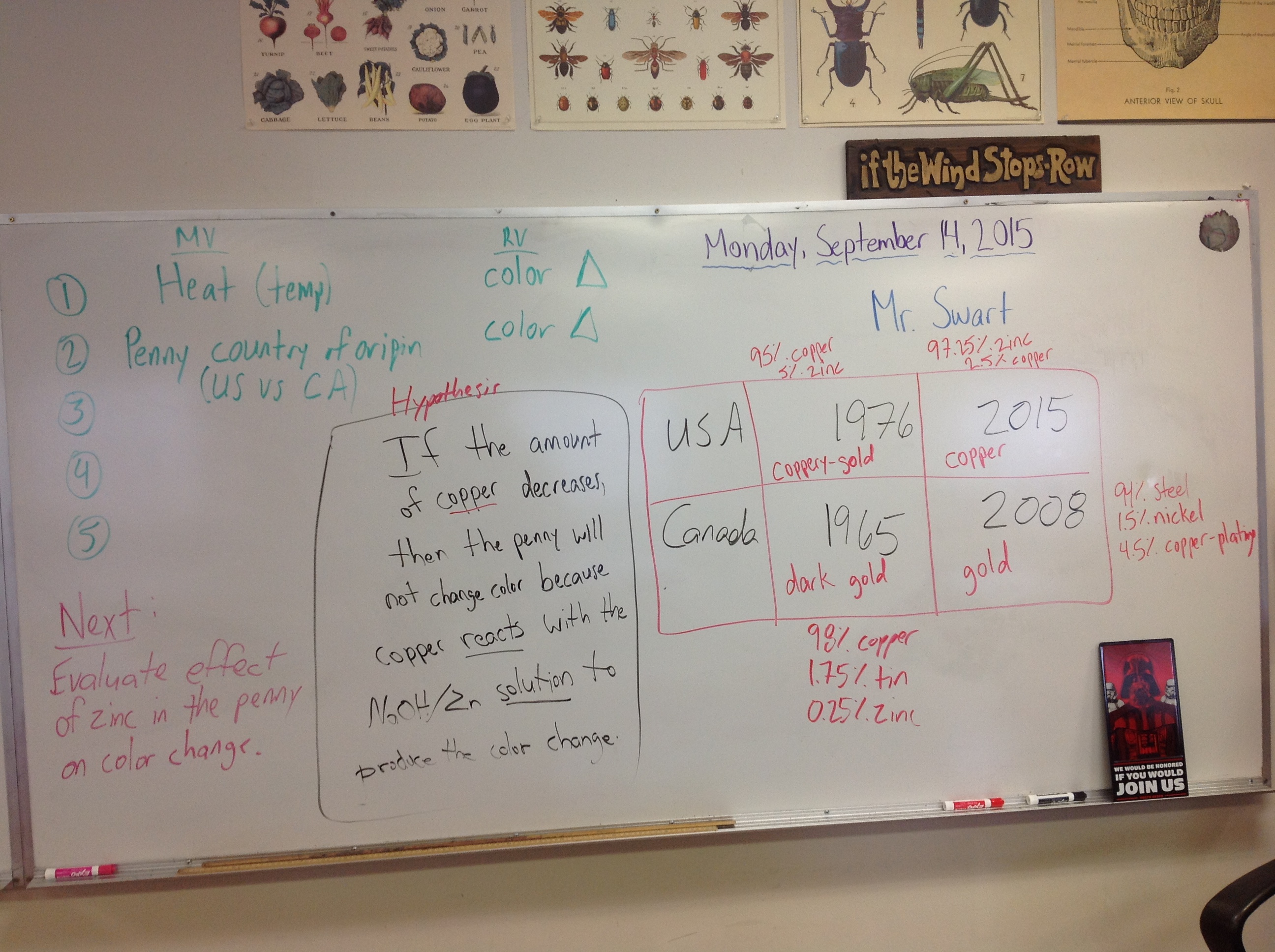 Monday (9/14): We modified the plan from Friday and decided to re-visit the demonstration approach for the Penny Lab. At the beginning of class, students were asked to share their hypothesis for the lab from last Friday. Students worked together to identify the manipulated and responding variables within their hypothesis statements, and a few brave students shared their variables with the class. We decided to use the class period to test whether pennies from the USA (pre-1982 and post-1982) exhibited different properties when placed in sodium hydroxide and zinc compared with pennies from Canada. We used Canadian pennies from 1965 and 2008 based on their differing metal composition (given in the picture below). We also crafted a class hypothesis statement and then wrote down each step of the experiment to document the procedure (below). At the end of the experiment, students described the color change and the pennies were photographed (also below). We wrapped up by noticing the color change in today’s experiment appeared to be inversely proportional to the amount of zinc in the pennies (i.e. the less zinc in the penny, the more gold color it became), thus completing one cycle of the scientific process.