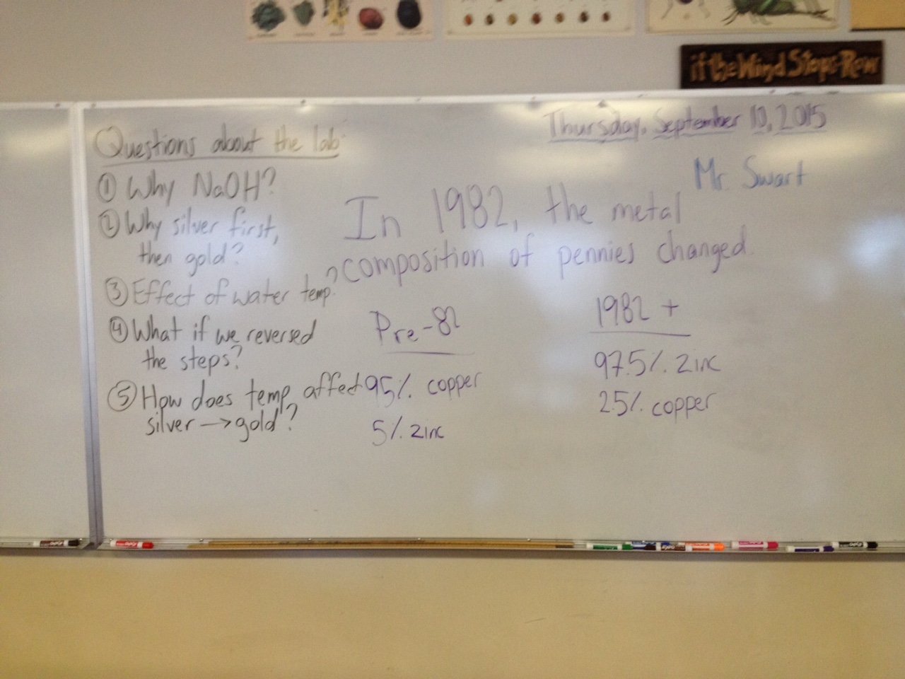 Today in class, we transformed the color of a copper penny to silver and then to gold. Following the steps outlined on page 6 of Lesson 2 of the textbook (A Penny for Your Thoughts), we immersed a 1979 penny (95% copper, 5% zinc) in a warm beaker of sodium hydroxide (3 M, about 40 mL) and zinc shot (enough to cover the bottom of a 150 mL beaker). After watching the penny change color to silver, tongs were used to transfer the penny to cool water. The penny was then transferred back to the hot plate (still set to 4) where it changed to a gold-copper color. The penny was placed back in cool water where it completed the transition to having a gold appearance. Students worked through most of the Lesson 2 worksheet in class. We wrapped up by making a list of questions students had about the experiment (pictured below). Those questions will form the basis for tomorrow’s lesson, where students will begin to probe how and why the penny changed color and whether the penny actually turned to gold. Students will write a hypothesis, carefully conduct the experiment documenting the steps they follow (the procedure), and then documenting the results of their experiment.