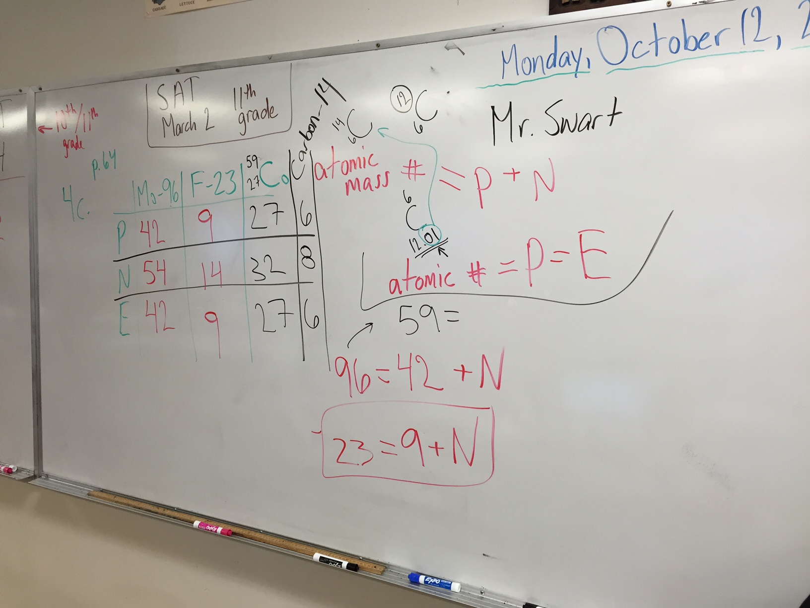 After the long weekend, we spent a majority of the class period reviewing Lesson 13. Students had a lot of great questions focusing on how to calculate the number of protons and neutrons in a given atom, how to wrote isotopes, and how to calculate the average atomic mass of an element given the frequency of naturally occurring isotopes. Pictures from the white board are shown below. At the end of class, students received copies of the Lesson 14 Worksheet and the Chart of Naturally Occurring Isotopes. Tomorrow, students will review the Lesson 14 PowerPoint, taking careful notes on slides 7-9 before working together to complete the worksheet and textbook questions 1-14. Email me with any questions.