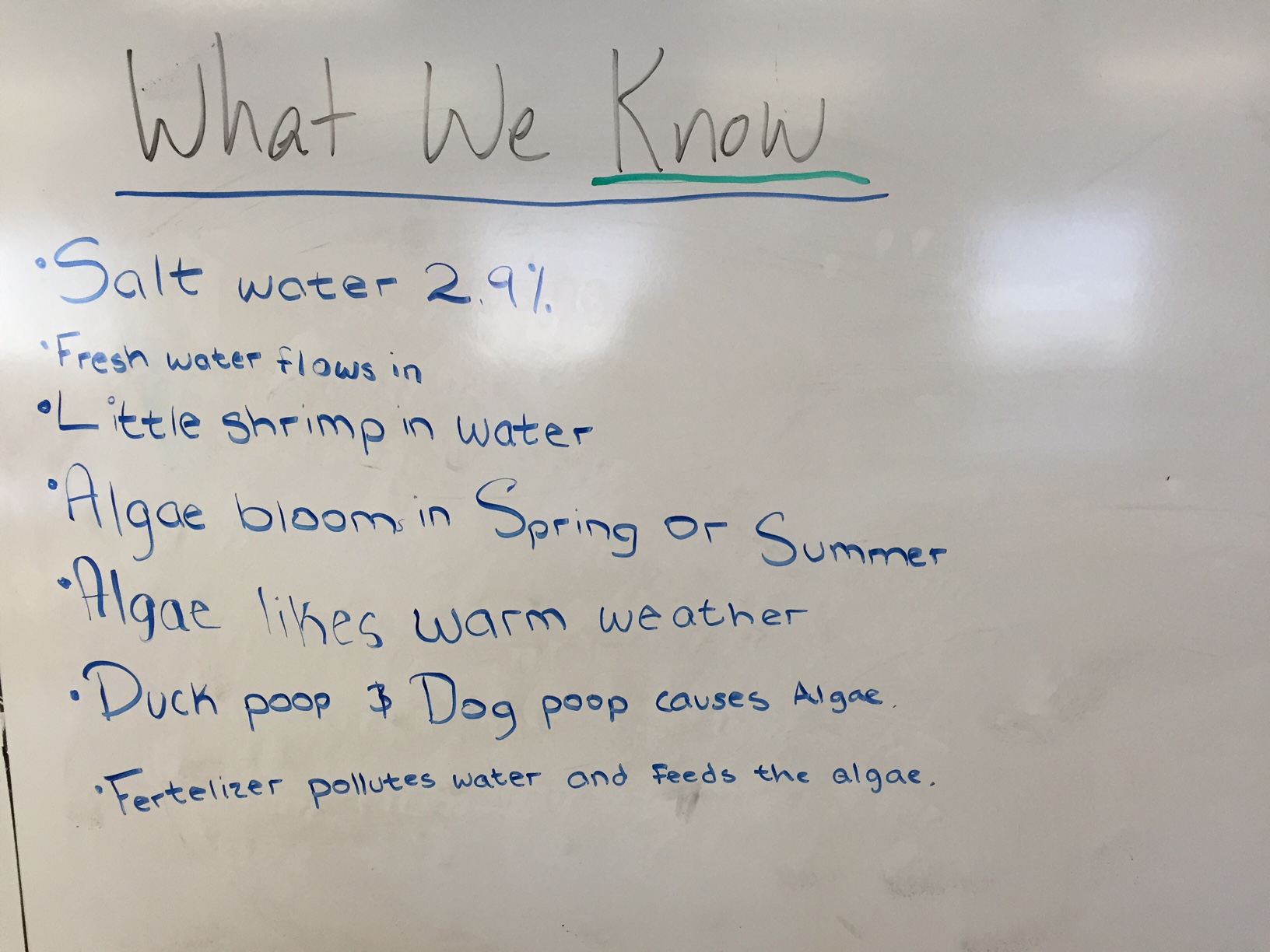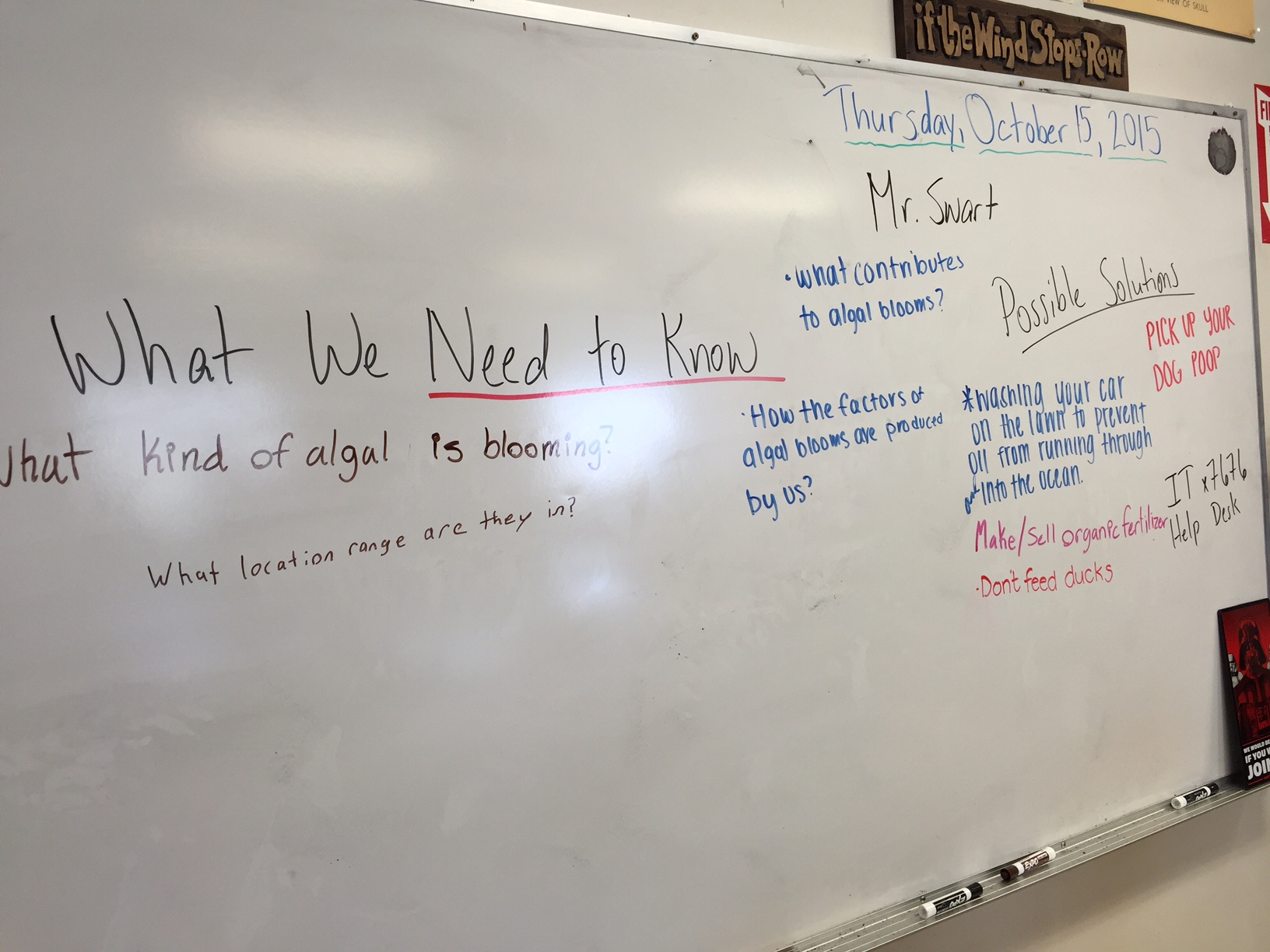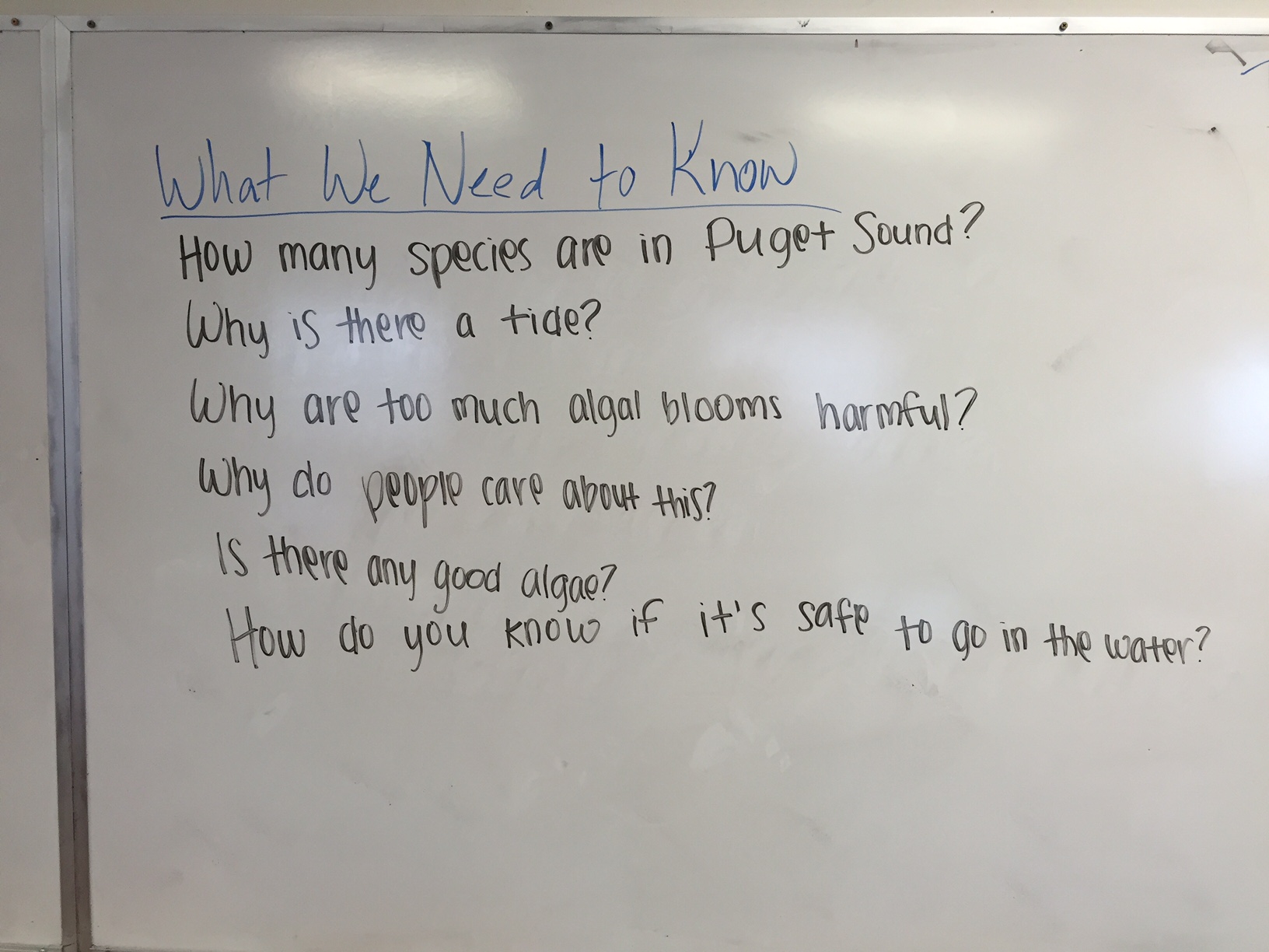 We began class with a pre-assessment of student prior knowledge of the learning targets encompassed by the final segment of our unit on cells and homeostasis. Next we launched the Seahurst Park PBL (problem-based learning) with a PowerPoint depicting a scenario familiar to students now that they have recently visited Seahurst Park and learned about harmful algal blooms locally in Puget Sound, as well as on a much larger scale off the West Coast (from Tuesday’s reading assignment). We concluded the class period with students taking the lead in creating the Know/Need to Know chart on the white boards at the front of the classroom. Student work is shown below, grouped by class period (click to enlarge).