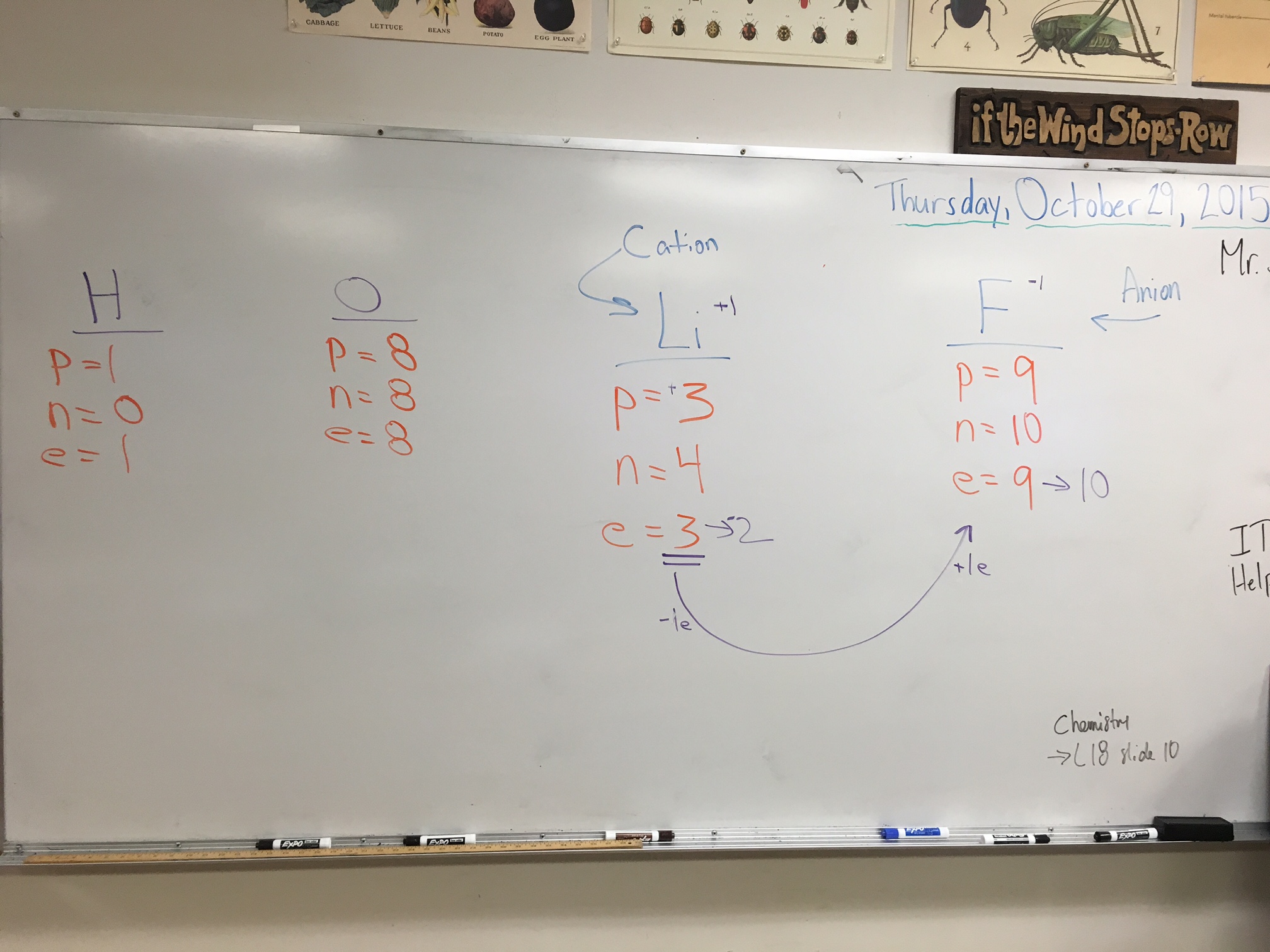 Our learning about electrons continued with the Lesson 19 PowerPoint introducing students to the concept of ions. Students received the Noble Gas Envy handout and we walked through the example on the whiteboard. The discussion prompted a student question about how two atoms of hydrogen bind with an oxygen atom to form a water molecule which was also captured on the whiteboard (pictured below). For classwork, students received the Lesson 19 Worksheet and the Ion Cards Game Cards that accompanies it. For homework, students should complete the Lesson 19 textbook questions #2-16 (evens only).