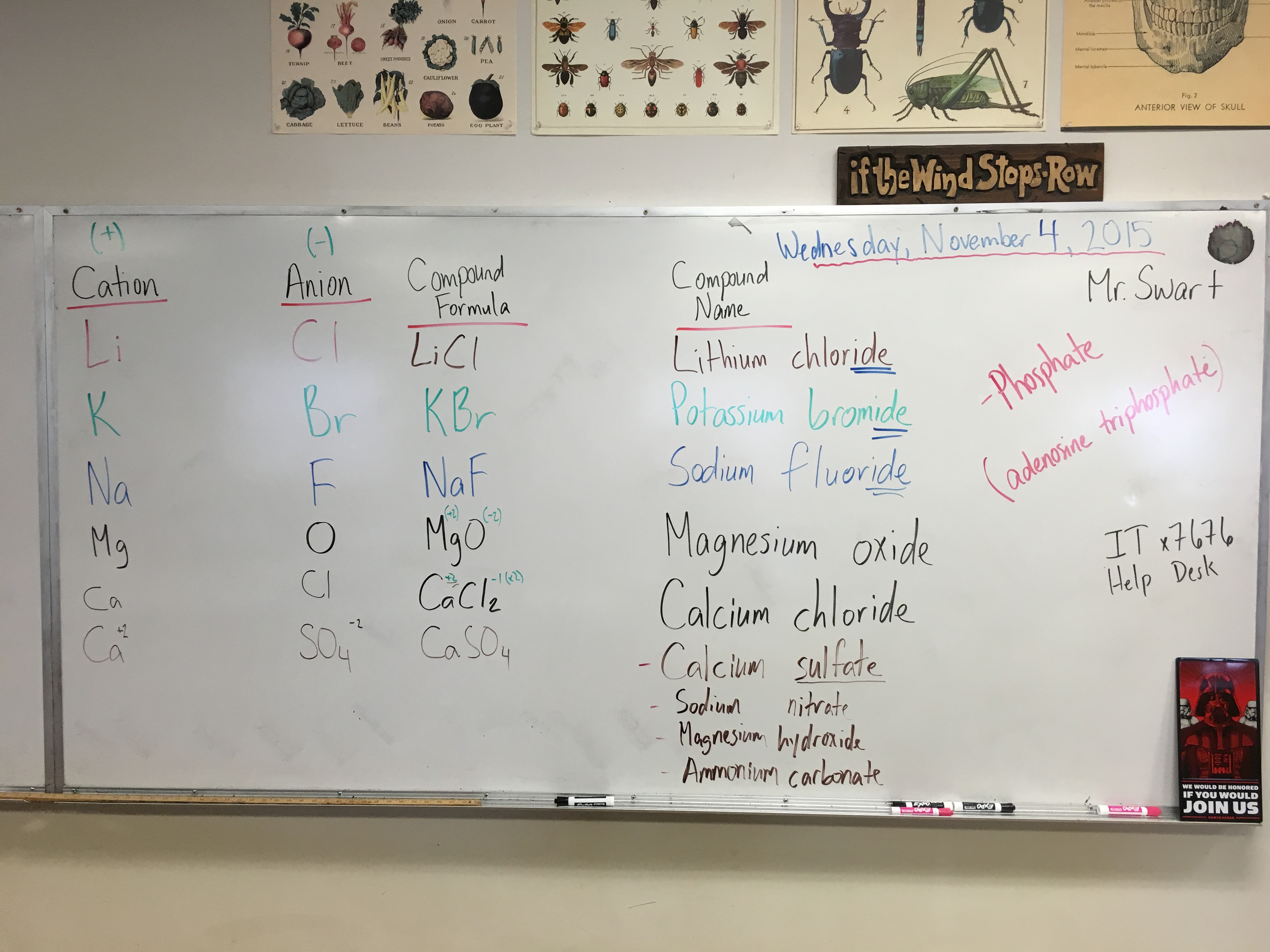 We elected to skip the Lesson 21 game and instead focused on answering student questions and continuing the work of learning how to name ionic compounds. We transitioned to Lesson 22, introducing the concept of polyatomic ionic compounds. Students were introduced to some of the more common polyatomic anions and cations, with a list of some of the compounds discussed pictured below: