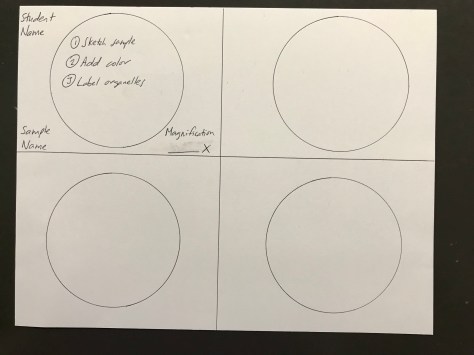 Next, for our first lab of Unit 1, students observed and made observations about various sections of plant and animal tissues under the microscope. Participation credit was received for students who sketched a sample, added color to the section drawn, and who labeled the visible organelles contained in a representative cell within the section. Students also needed to write down the name of the sample they observed and the magnification at which the observation was made.