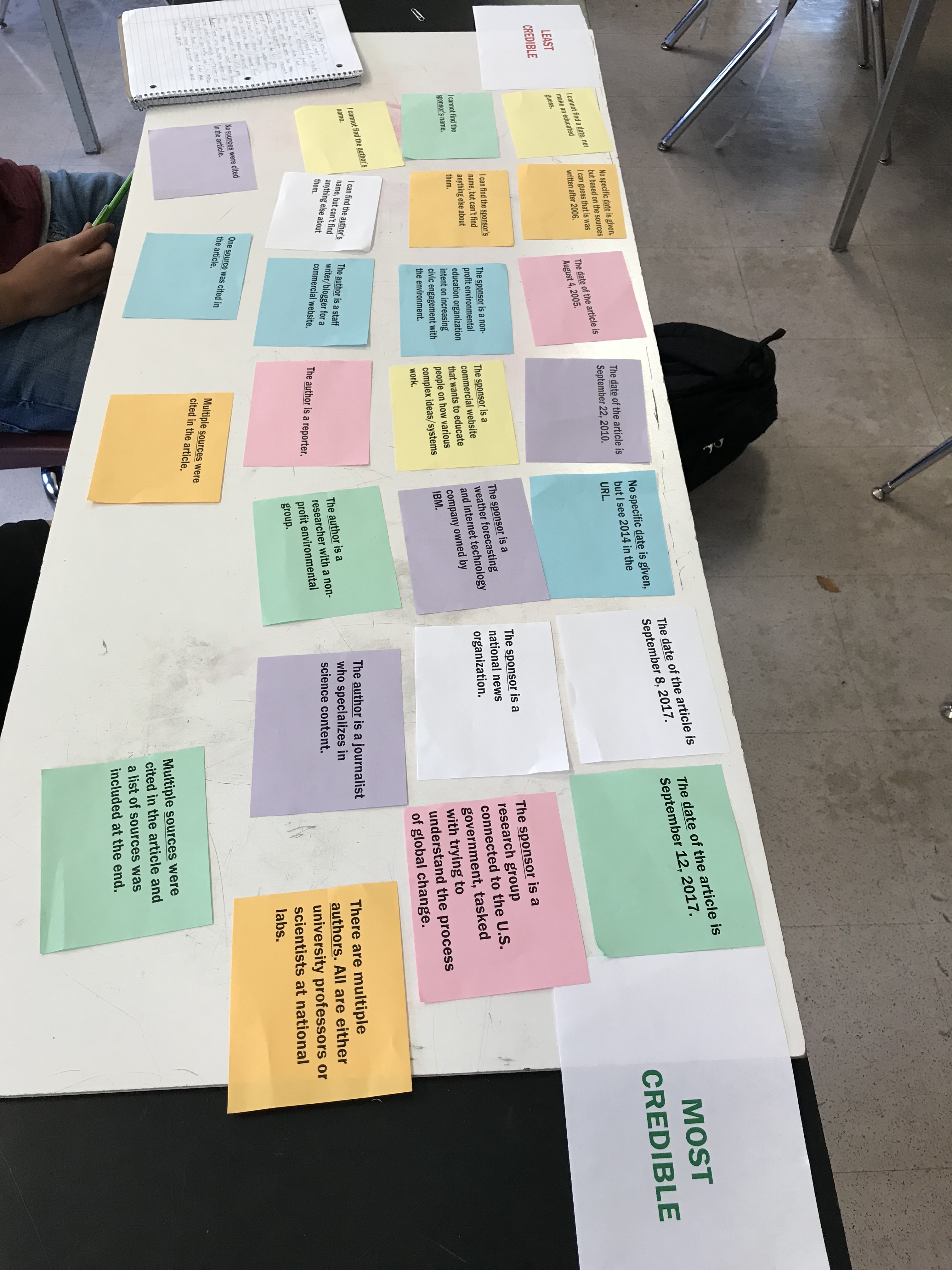 To complete the assignment, students were tasked with selecting two cards from each set (author, sponsor, date, and sources) and explaining why one card is more credible than the other using the following sentence frame, “Card A is more credible than Card B because…” and inserting the written contents from cards A and B into the sentence. Students completing all four sentences received credit for the assignment.