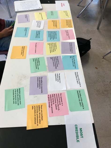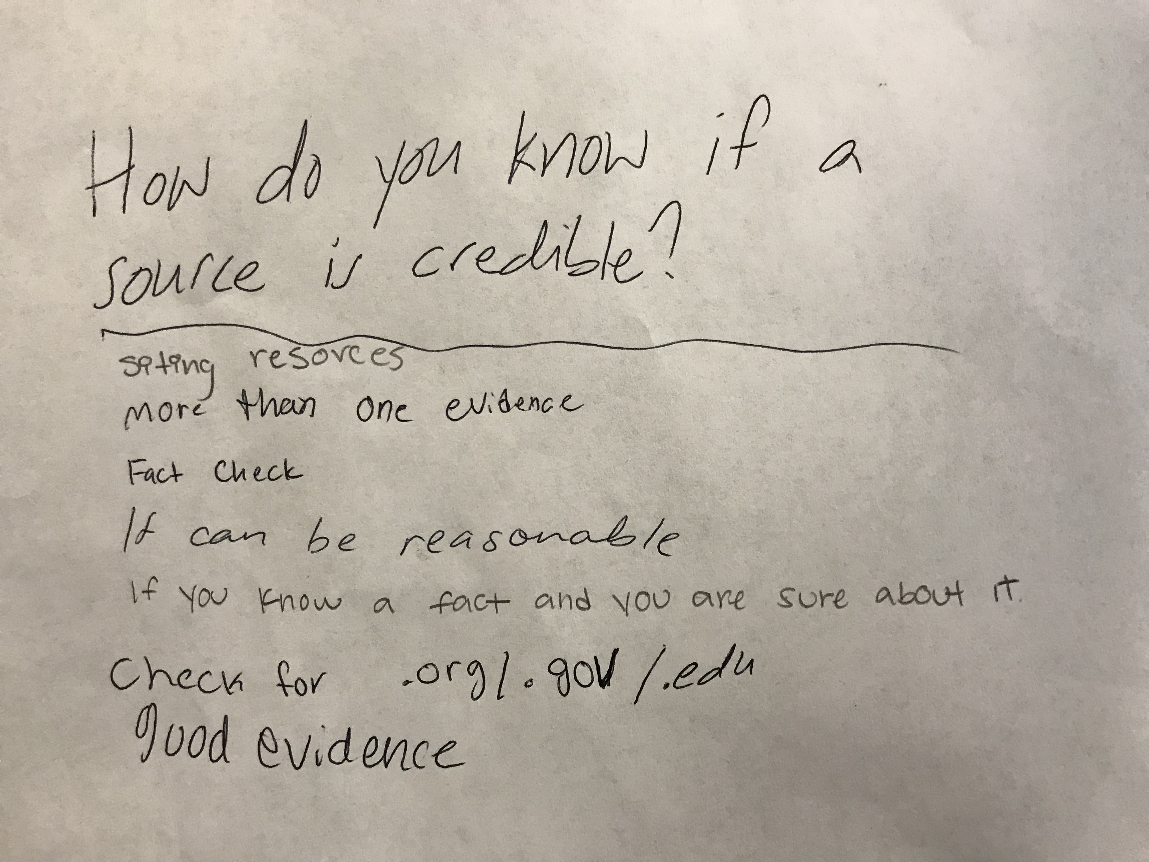 Using resources provided by our amazing librarian, students learned techniques to determine whether an online resource is credible. We began with a discussion of how students determine whether or not a resource is credible: