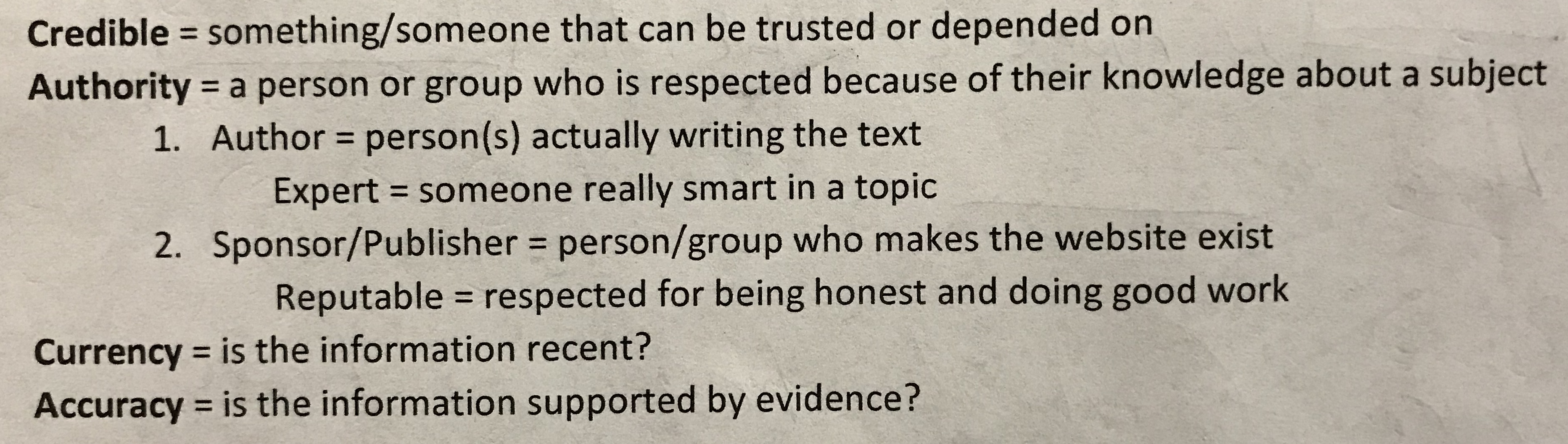 After a brief discussion, we discussed the concepts of credibility, authority, currency, and accuracy. Students recorded the following notes in their notebooks: