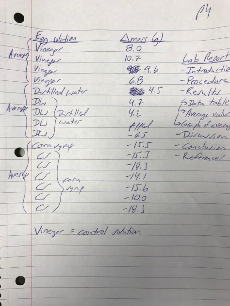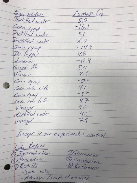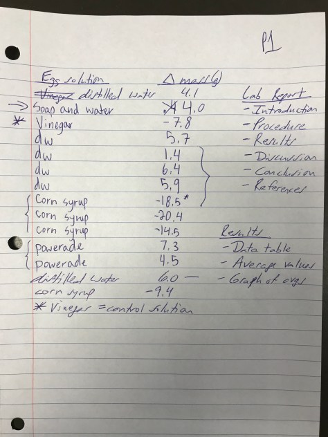 To calculate the change in mass, students were instructed to subtract the initial mass (measured yesterday) from the final mass (measured today). A positive change means the egg gained mass. A negative change means the egg lost mass. Students reported out their data (shown below), and then we discussed the movement of water across the membrane of eggs placed in various solutions (final picture below).