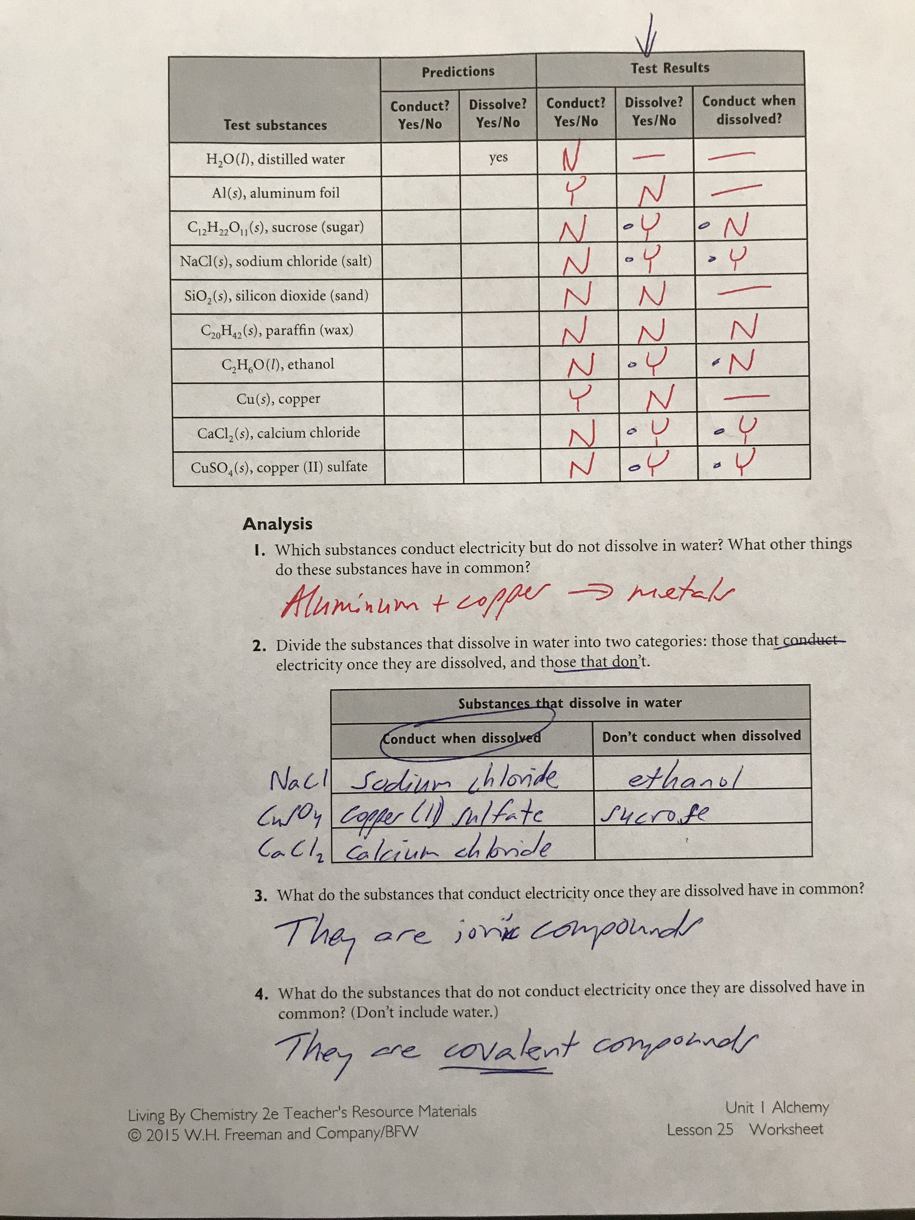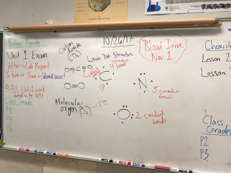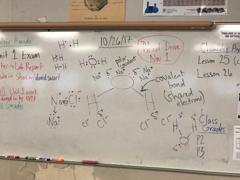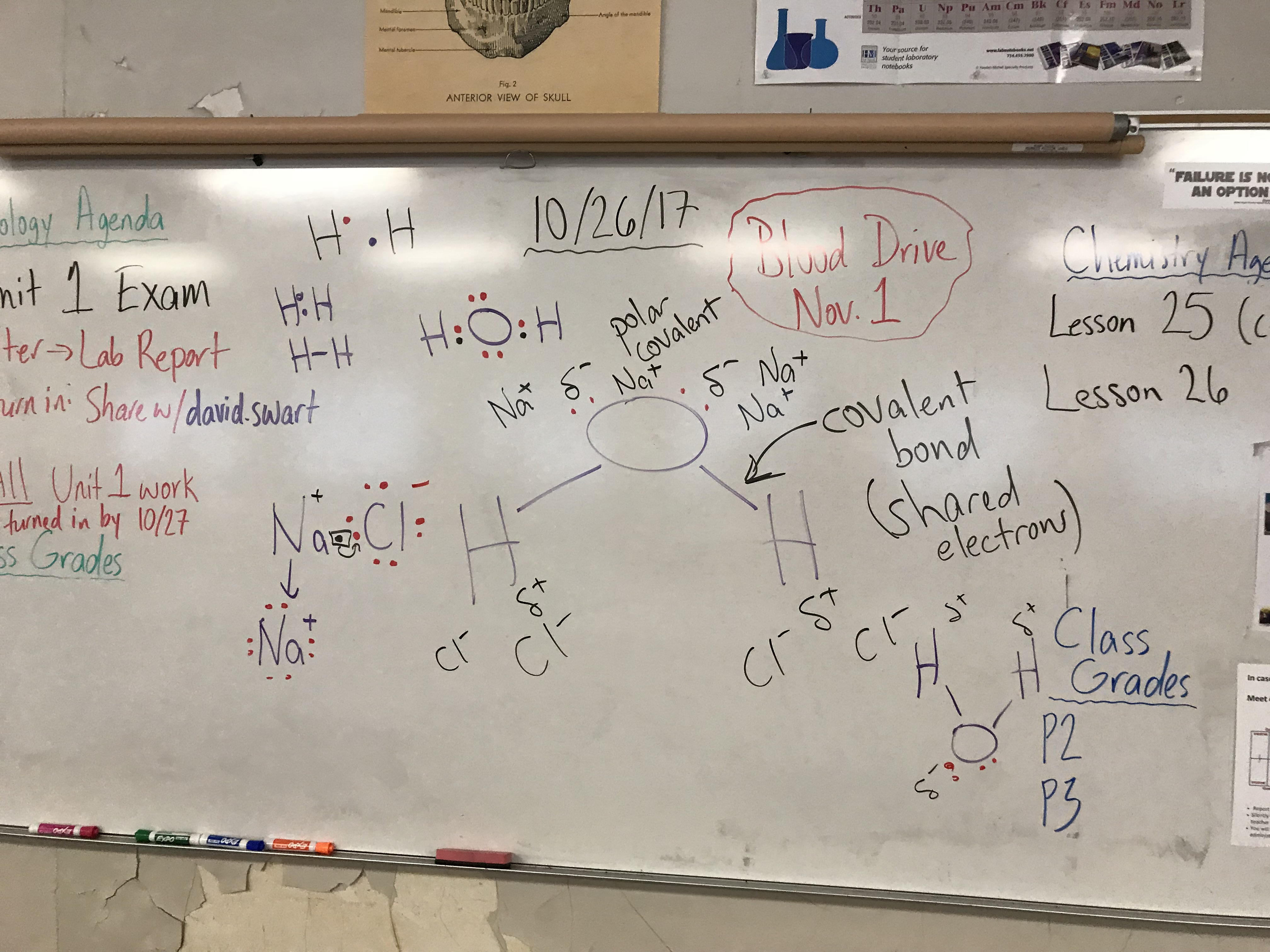 That work led to a broader discussion of bonding, the theme of Lesson 26. I introduced the concepts of Lewis Dot Structures, covalent bonds, and polar molecules. I used those concepts to explain why ionic compounds dissolve in water, thus enabling them to conduct electricity. The intent was for students to develop an understanding for where our study of chemistry is headed and to challenge them to stay actively engaged in their learning. Notes from that portion of the lesson are shown below: