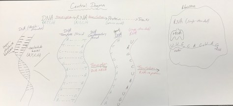 After wrapping up the discussion from the previous day’s lesson about The Double Helix, we launched into an investigation of the process of Central Dogma. Students learned how DNA codes for RNA which codes for protein, with everyone drawing out the notes shown below. We drew out the processes of transcription and translation, using a guided worksheet approach to help students understand what happens at each step of the process. We worked through worksheet question 15 (identifying codons) and will continue our exploration of Central Dogma and complete the worksheet packet tomorrow.