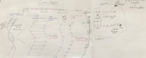 We completed drawing our model of Central Dogma and then students had the remainder of the class period to work through the worksheet from yesterday. Drawings were collected (students will receive credit for their work) and the worksheet is due by Friday for credit. Below is an updated picture of our model: