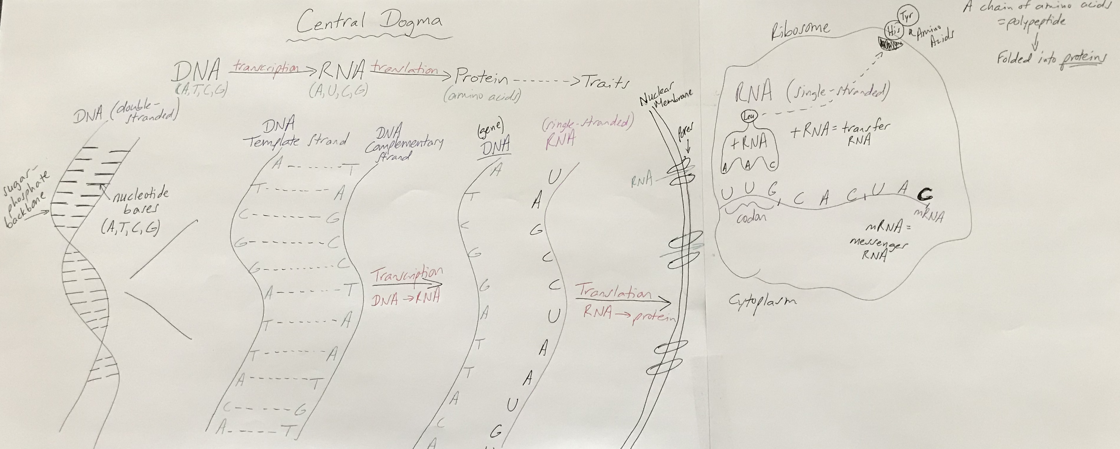 After wrapping up the discussion from the previous day’s lesson about The Double Helix, we launched into an investigation of the process of Central Dogma. Students learned how DNA codes for RNA which codes for protein, with everyone drawing out the notes shown below. We drew out the processes of transcription and translation, using a guided worksheet approach to help students understand what happens at each step of the process. We worked through worksheet question 15 (identifying codons) and will continue our exploration of Central Dogma and complete the worksheet packet tomorrow.