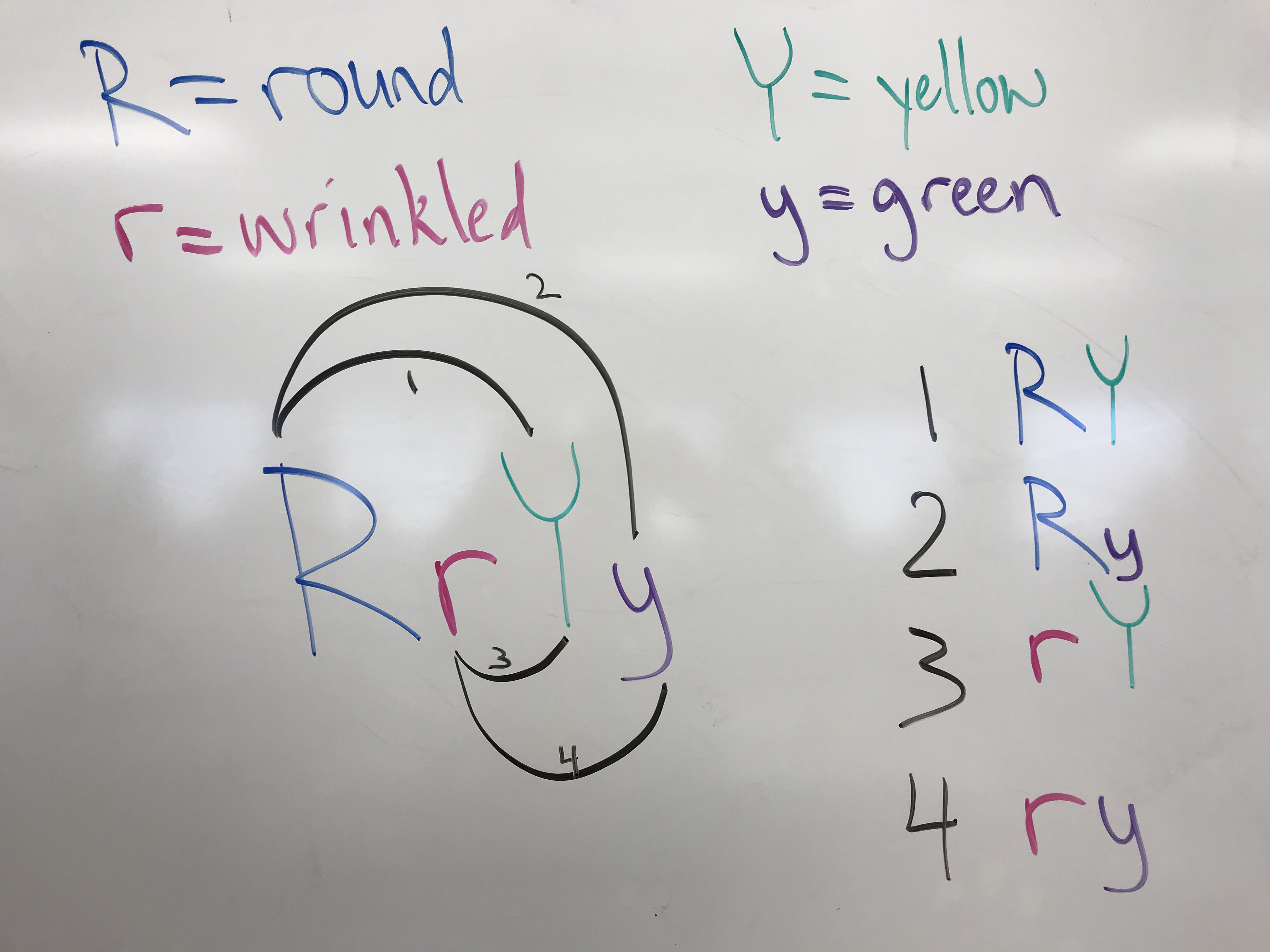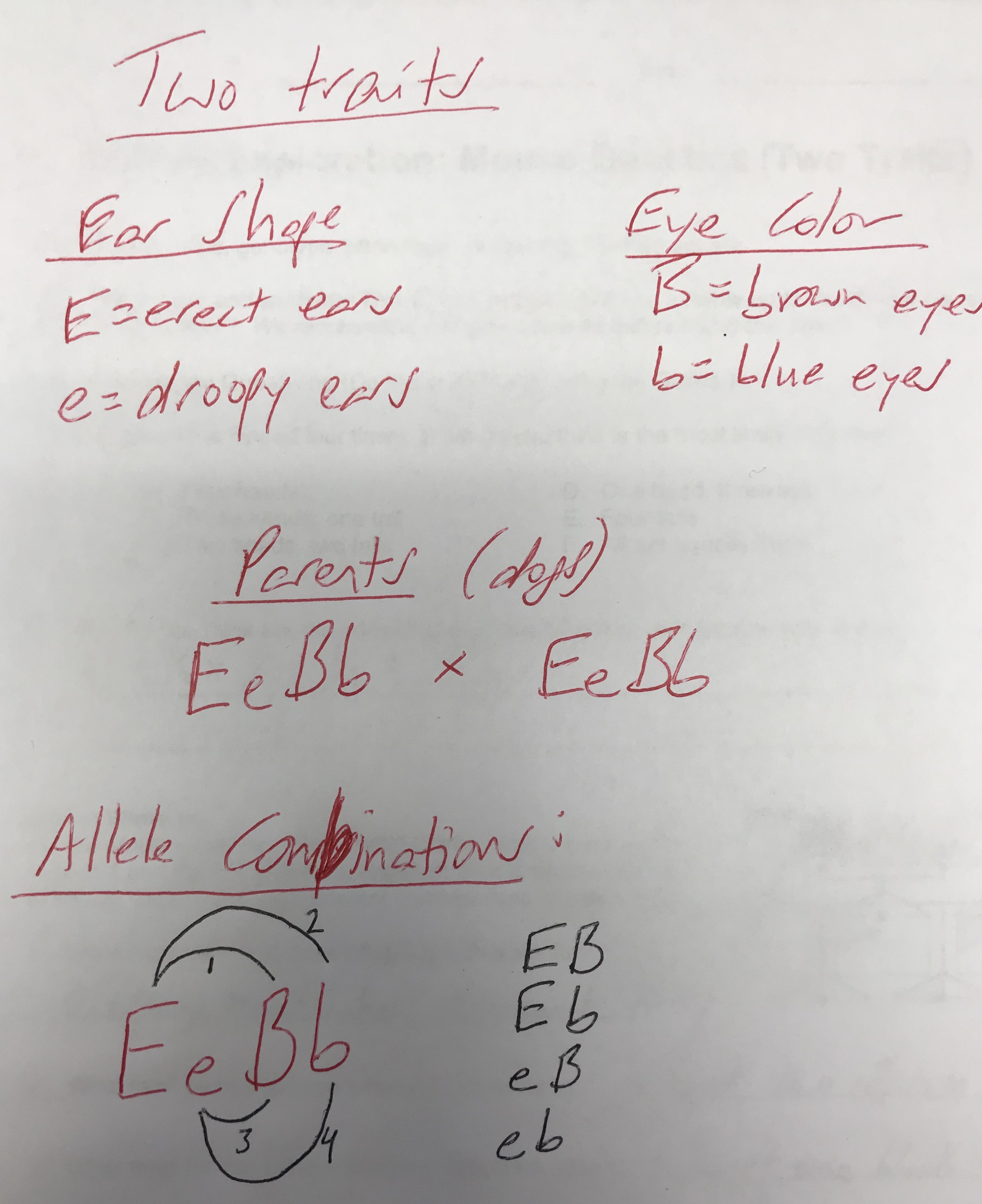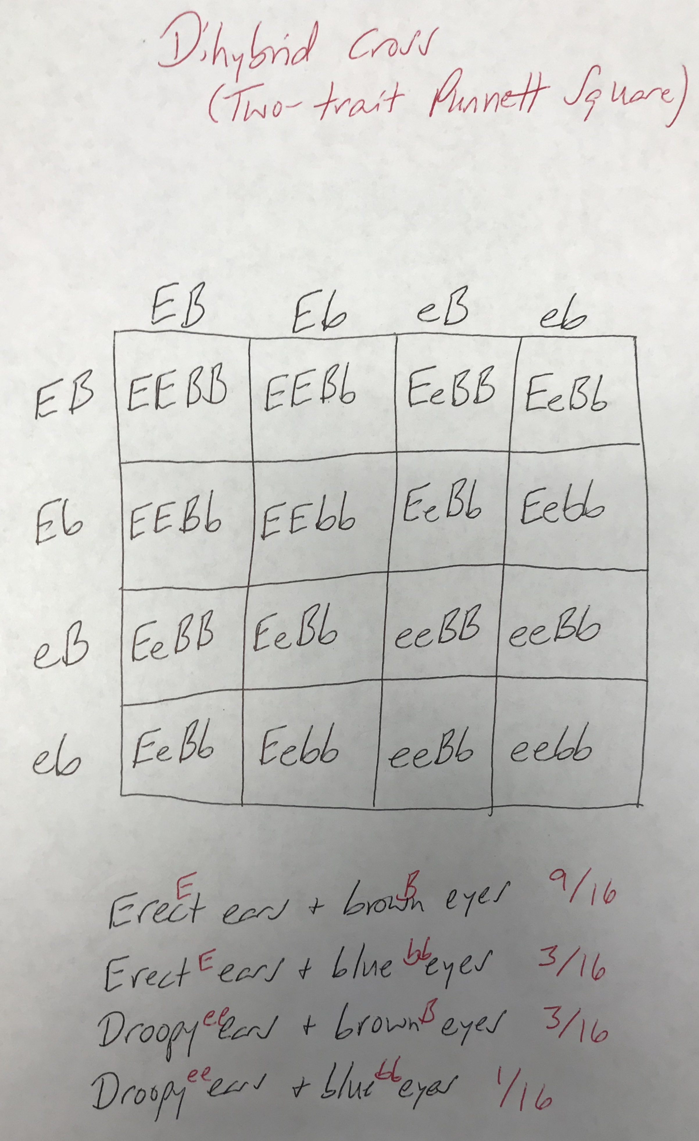 As a review from last week’s work on monohybrid crosses (single-trait Punnett Squares) and to extend student learning of Punnett Squares to dihybrid crosses (two- traits Punnett Squares), we began class with the following video by Mr. Anderson of Bozeman Science:
