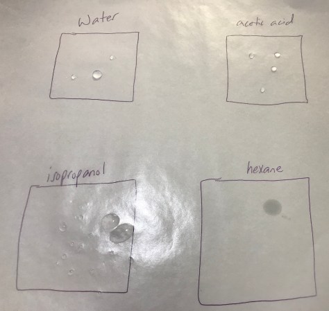 Students were tasked with writing a detailed procedure in advance of the lab tomorrow. At the end of class, we tested the response of the four test liquids when dripped onto a piece of wax paper: