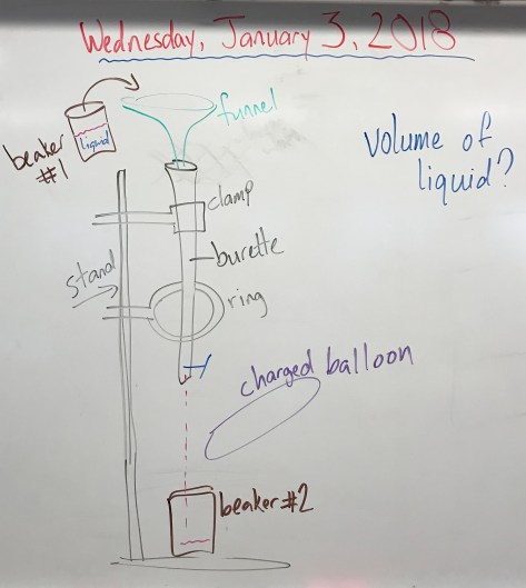For the lab, there were four stations set up around the classroom containing all of the necessary equipment and materials to conduct the lab. Students also could use the drawing on the white board (below) to aid in their lab setup. Students had to follow their written procedures, which meant revising them a needed to actually complete the lab. Results were summarized at the end of class (water, acetic acid, and isopropanol were all attracted to the charged balloon, while hexane was not). Students realized that the acetic acid we used (36% acetic acid) contained water, as did the isopropanol (70%). To determine whether the water in both solutions might be responsible for the attraction observed, we tested glacial acetic acid (100% acetic acid) at the end of class and found it to be highly attracted to the balloon.