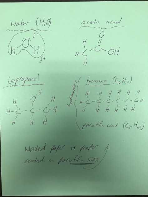 We kicked off 2018 with Lesson 42: Attraction between molecules. Students received the Lesson 42 worksheet and then we briefly reviewed functional groups and the concept of polarity. The lab calls for students to observe the characteristics of water, acetic acid, isopropanol, and hexane (molecular structures are shown below):