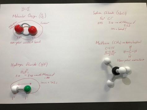 We then investigated four different molecules and discussed the connection between molecule geometry, atomic composition, and how to calculate the difference in electronegativity between two atoms. Students learned that non-polar covalent bonds have a difference in electronegativity of 0.5 or less. An electronegativity difference greater than 2.1 results in an ionic bond. Values between 0.5-2.1 result in polar covalent bonds.