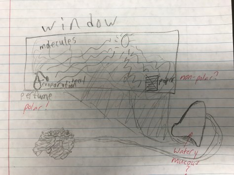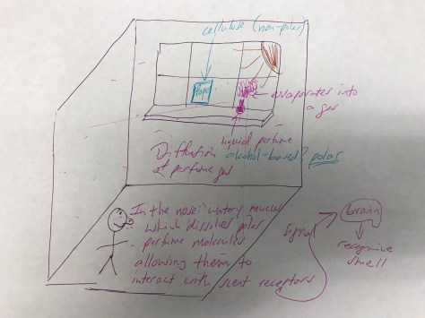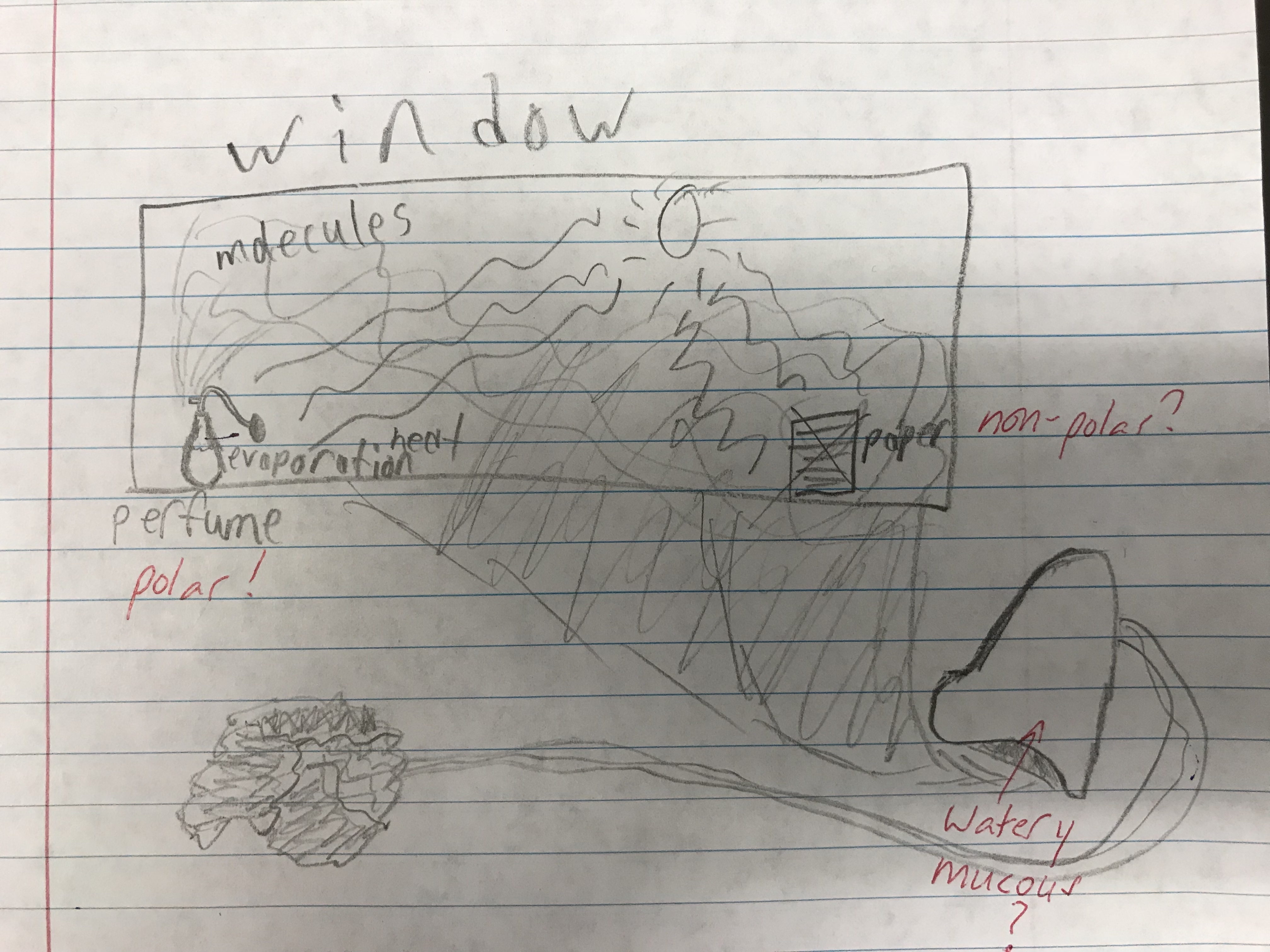 Student explanation of why we can smell perfume but not paper left in a sunny window.Teacher-drawn explanation using student-generated ideas