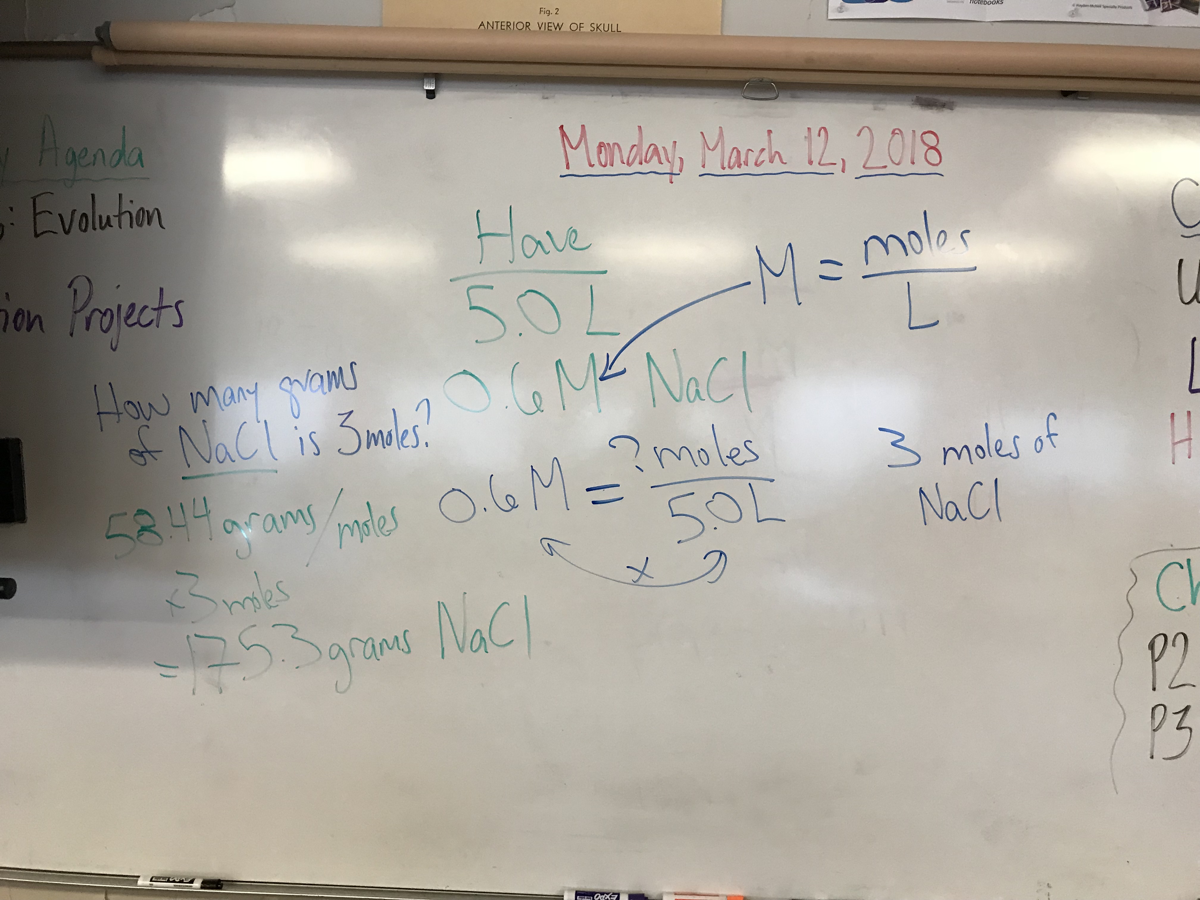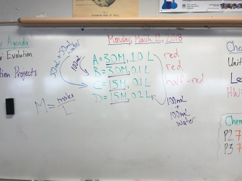 Our work today involved thinking about solutions from a molecular perspective. Students briefly reviewed yesterday’s Gummy Bear portion of the lab via the ChemCatalyst on slide 3 of the Lesson 81 PowerPoint. Students then received the Lesson 81 Worksheet and the Particle Views Handout. The handout was used in Part 1 of the worksheet. For Part 2, students did the mental work of thinking through how to prepare solutions with different volumes and molarities. They then observed the outcome of preparing those solutions. The lesson helped illustrate the connection between molarity (M), particle density, and the number of moles (particle number) in a solution. Pictures from the white board are shown below.