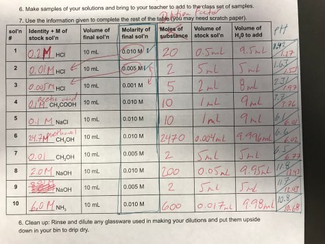 On Wednesday, we powered through the Lesson 86 lab, collecting pH data from 10 different solutions. Students did a fantastic job preparing concentrated stock solutions, diluting stock solutions, and measuring pH with our one functioning digital pH probe. Results from both classes are shown below, with second period results in green and third period results in red.