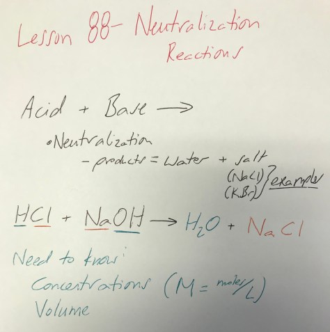 For our first lesson back from Spring Break, we launched in to Lesson 88: Neutralization Reactions. Notes from the lesson are shown below: