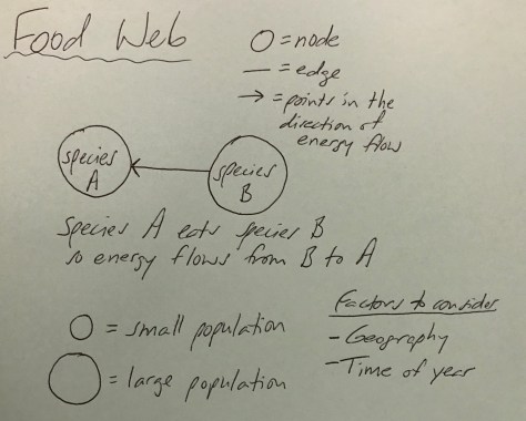 To conclude our work this week, we will assemble a food web of as many species as we can based on the research students did over the past few days into abiotic factors, biotic factors, and populations data. Important vocabulary we will use to build our food web includes node, edge, and energy flow. Class notes are pictured below: