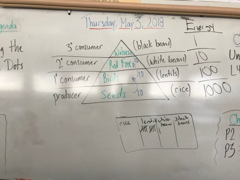 After several days of research and reading, we lightened the mood with the Food Web Game. Students teamed up into groups of three, with each team receiving a container of rice. The rice represented seeds, which comprised the base of our food chain. One member of the team counted out 10 grains of rice and handed them to the runner who traded them in for one lentil. The recorder wrote a tally mark to indicate they had received a lentil on a note card. When the team reached 10 lentils, they traded those in for one white bean (representing a red fox). The game ended when the first team was able to trade in 10 white beans for one black bean and then all members of the team had to howl like a wolf. The game helped represent the energy it takes to sustain a single tertiary consumer, with energy loss represented by the energy students spent running back and forth during the activity.