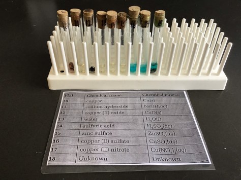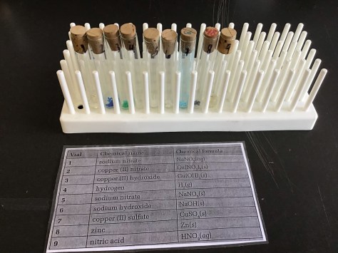 For our first lesson of Chapter 2, students took notes from the Lesson 6 PowerPoint to introduce students to chemical names and symbols. Students then had the remainder of the class period to make observations about 18 test tubes containing various chemical elements and compounds and filling in the table in their Lesson 6 worksheet.