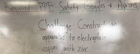 Update: 11/15 – We will be spending the day in the lab. Students will work in groups of four, using the Electroplating Handout and the materials provided (1.5 V D-cell battery, battery holder, two aligator clips, beaker with 200 mL electroplating solution, and two nickels) to set up and conduct the lab. Students who complete the lab efficiently will have the opportunity to extend their learning by modifying aspects of the lab using various teacher-supplied materials.