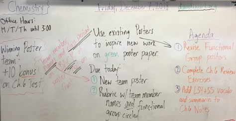 Instructions for the review today were written on the white board (pictured below). Students had the class period to create the best possible functional group poster using posters from all five of my chemistry classes as resources. Remaining time was to be used working through the Chapter 6 Review Exercises from the textbook, and adding vocabulary and summaries from lessons 34 and 35 from the book. Note: the Chapter 6 test on Monday will only include questions covering Lessons 28-33.