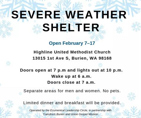 Please stay warm and safe this weekend. If you or anyone you know needs help staying warm, please see the flyer below (distributed by Highline Public Schools Central Office).