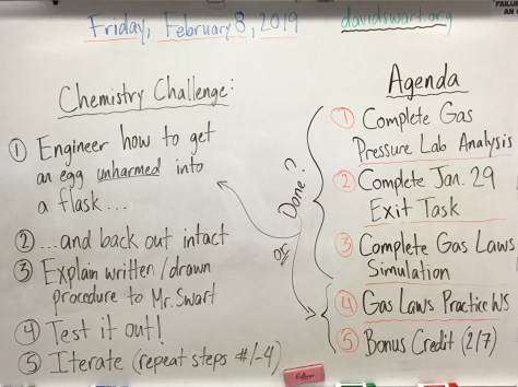With Snowpocolypse on the horizon, rather than introduce the Combined Gas Law, students had the class period to complete unfinished assignments, practice the gas laws, or attempt the chemistry challenge. For convenience, here are links to:
