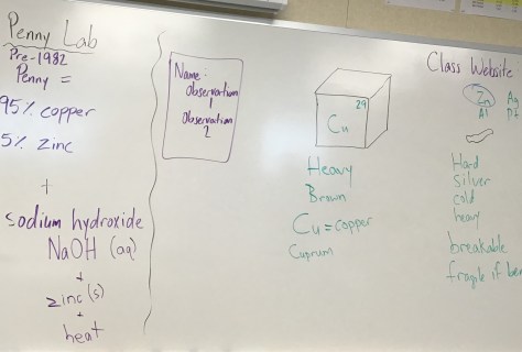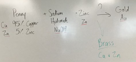 We concluded the class period with a discussion of what students observed. The discussion generated an impressive number of hypotheses and testable follow-up questions, so we may revisit this as a student-led lab in the near future (once all those safety contracts are turned in!). Students clearly understood that the gold color of the penny was not an indication that the penny had literally turned to gold – the gold color is attributed to increasing the percentage of zinc as part of the penny, which manifests as a gold color after heating the penny to integrate the zinc atoms within the copper atoms of the penny and thus creating brass!