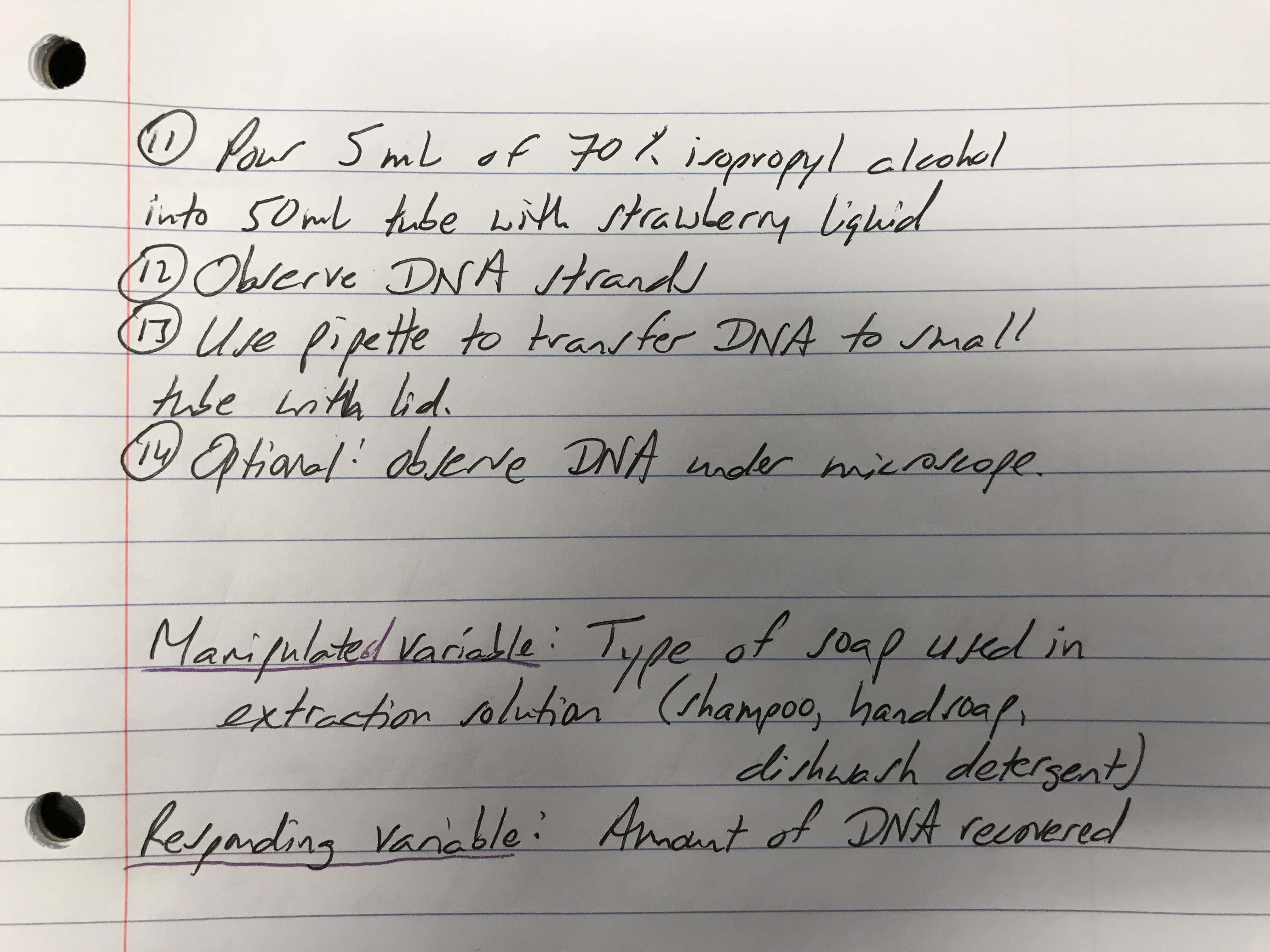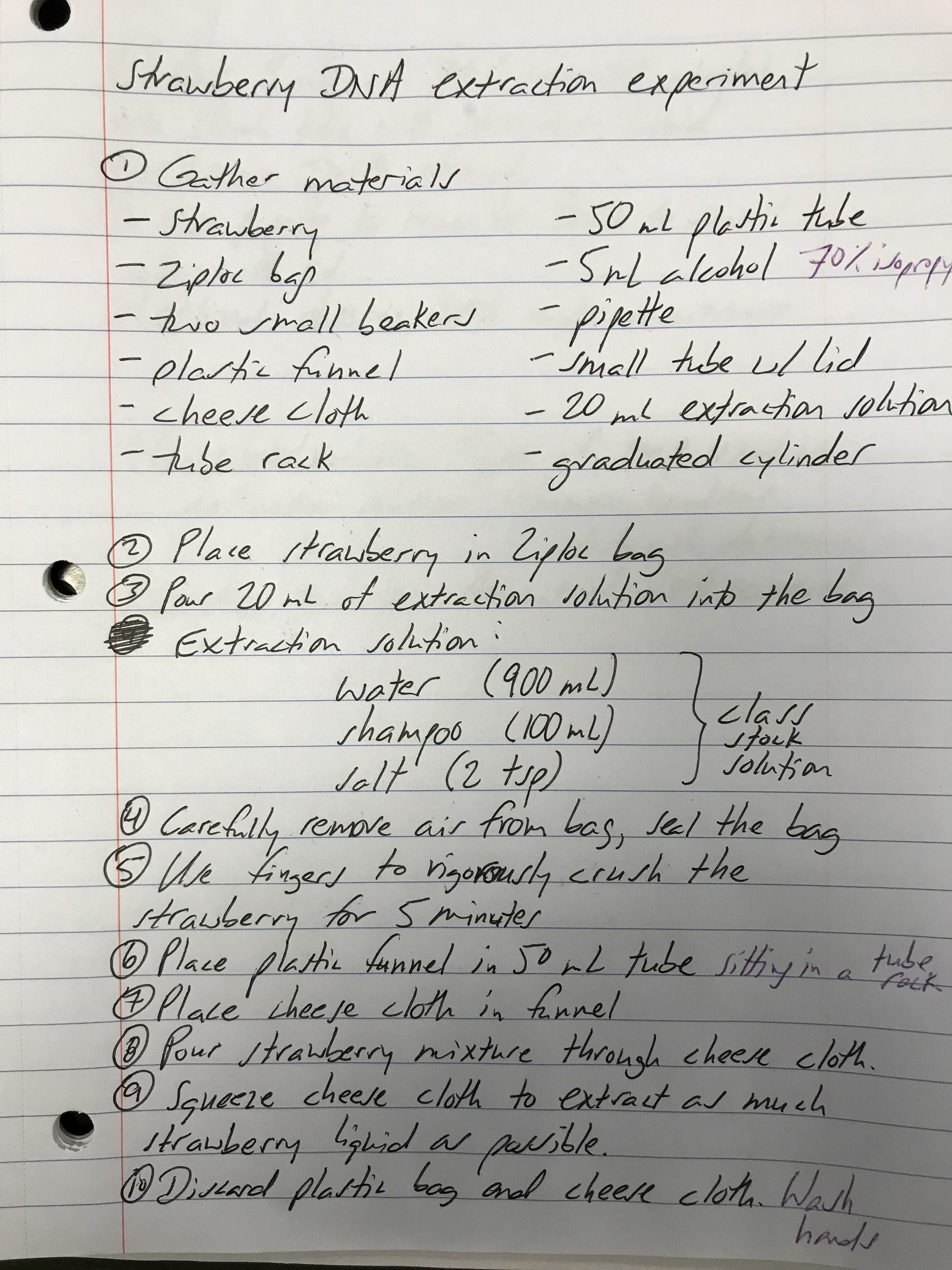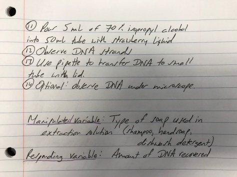 Thursday, October 3 (HS-LS1-1): In our continued study of Central Dogma, we set our sights on extracting DNA from strawberries.  To prepare for the lab, students watched a video explaining the DNA extraction procedure (produced by the North Carolina Community Colleges group NCBioNetwork.org).  Students watched the video and wrote down as many details as they could.