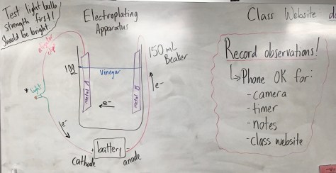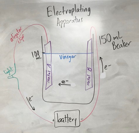 After the video, we discussed how to set up an electroplating apparatus (pictured below) and also discussed safety concerns and required personal protective equipment to be worn during the lab tomorrow (goggles and lab apron required, hair tied back, closed-toe shoes). Students then worked with their table team to design an electroplating experiment and write up a procedure to follow tomorrow.