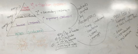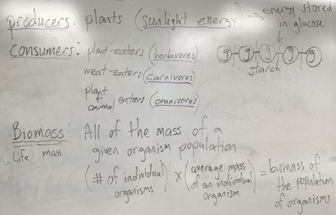Tuesday, December 3, 2019 (HS-LS2-4): We will begin class with some interactive class notes. Students will revisit the vocabulary of producers and consumers from yesterday’s Gizmo, and we will add the vocabulary terms of primary, secondary, and tertiary consumers, as well as decomposers. We will review the movement of energy in a food web, and discuss how organisms use (and lose) energy. Finally, we will discuss the concept of biomass and apply the 90% rule to the trophic levels as introduced in yesterday’s Gizmo. After completing our notes, students will work through the Forest Ecosystem Gizmo.