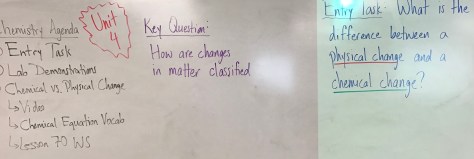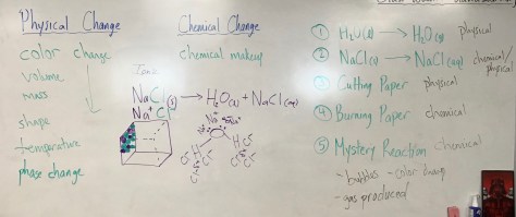 For our introductory lesson of Unit 4, we revisited the concepts of physical and chemical change in the context of chemical reactions. The lesson began with a series of demonstrations. Students were tasked with recording observations and then determining whether a chemical or physical change had taken place.