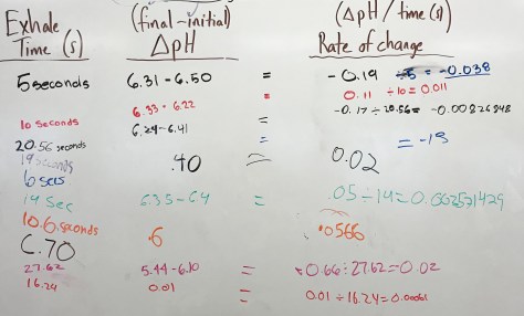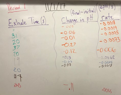 After completing the lab, students processed their data and recorded it on the white board for everyone to see. Not everyone had time to record their data, so the class data sets pictured below will be revisited soon: