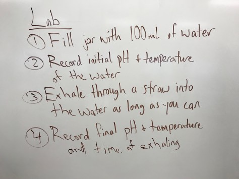 Next, we discussed the connection between carbon dioxide and pH, and then students observed a demonstration for how to use probeware to measure pH and temperature. Students wrote down the following procedure in their lab notebooks: