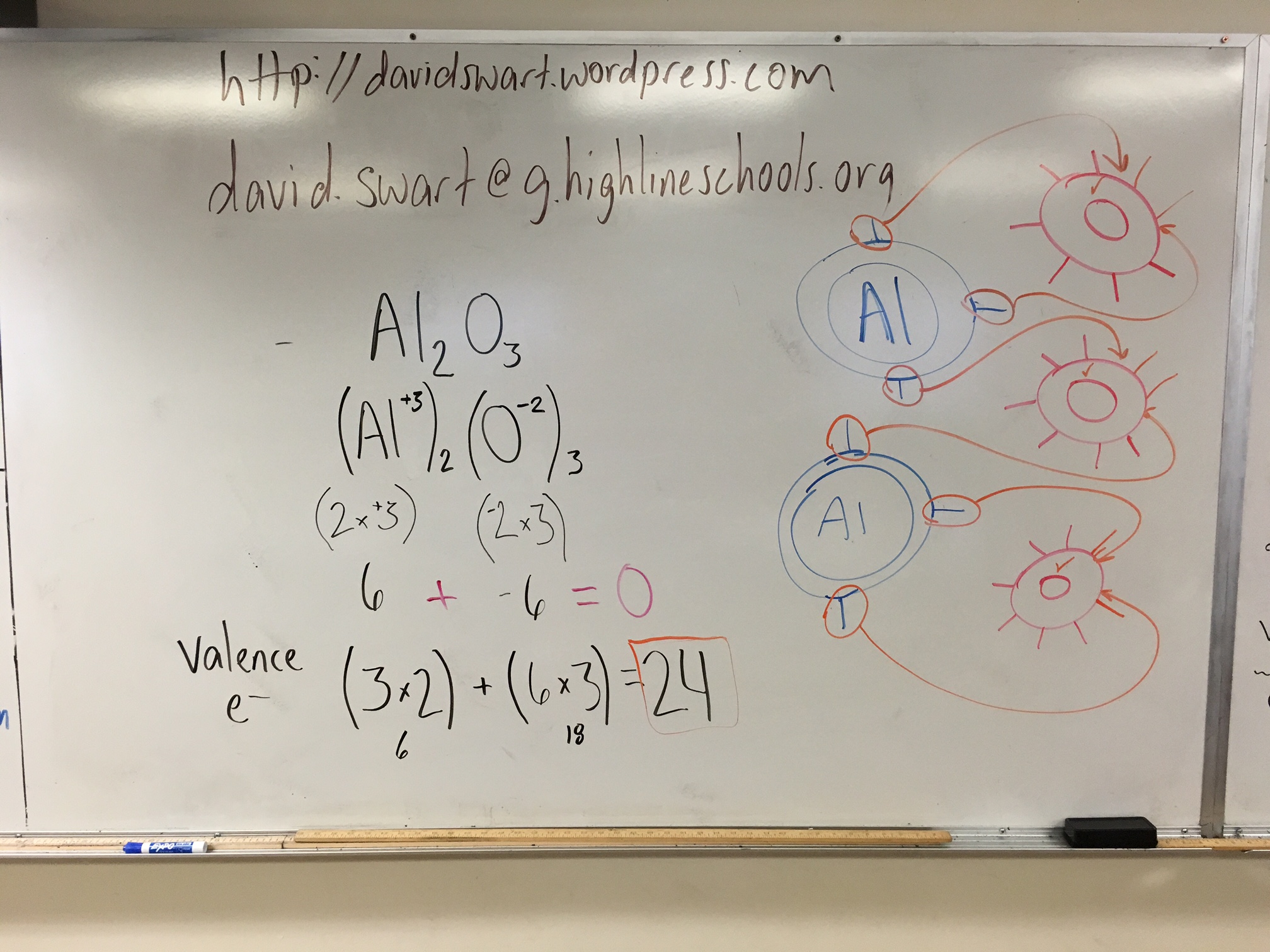 Many students were able to draw molecular oxygen (O2, with a double bond between the two oxygen atoms), water, and carbon dioxide (also with double bonds connecting the central carbon atom to the two oxygen atoms). The molecular structure of glucose (C6H12O6) was far more challenging. We transitioned into Lesson 32, which brought together the concepts of molecular structures, valence electrons, covalent bonding, and Lewis dot symbols. We reviewed the Lesson 32 PowerPoint and then students worked in groups of four to complete the Lesson 32 worksheet. To help students visualize molecular structures, we used the molecular modeling kits. The kits were especially helpful in helping students understand double and triple bonds.